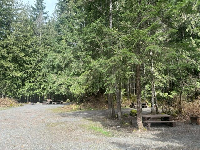 The site is equipped with 4 fire rings, 4 picnic tables, and 1 pit toilet. There is no running water or garbage collection on site.